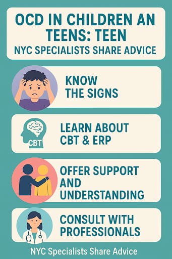 - Therapists in NYC believe parents should educate themselves on OCD so that parents can learn to differentiate between normal thoughts and worries, and obsessive-compulsive behaviors.Â