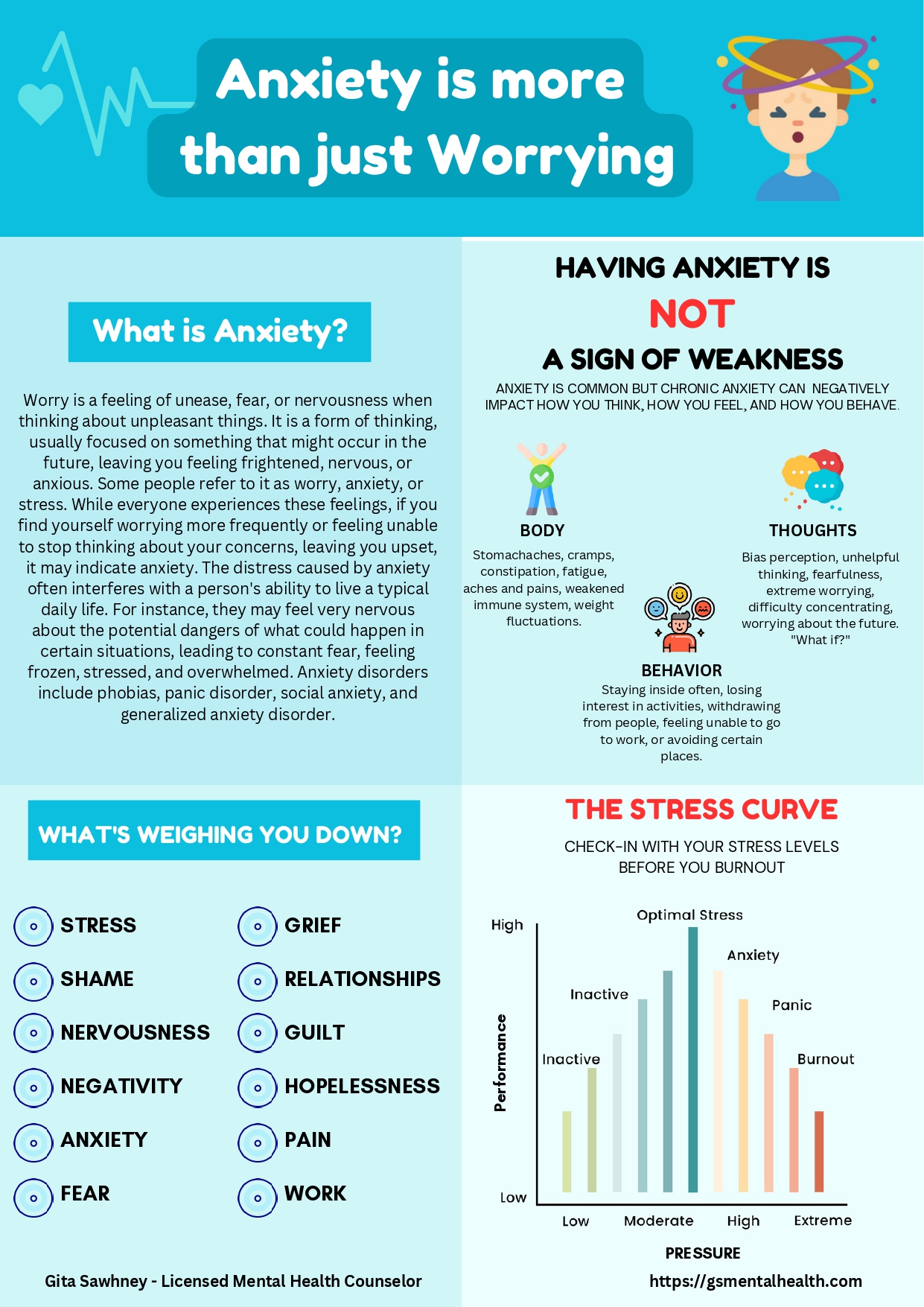 Worry is a feeling of unease, fear, or nervousness when thinking about unpleasant things. It is a form of thinking, usually focused on something that might occur in the future, leaving you feeling frightened, nervous, or anxious. Some people refer to it as worry, anxiety, or stress. While everyone experiences these feelings, if you find yourself worrying more frequently or feeling unable to stop thinking about your concerns, leaving you upset, it may indicate anxiety. The distress caused by anxiety often interferes with a person’s ability to live a typical daily life. For instance, they may feel very nervous about the potential dangers of what could happen in certain situations, leading to constant fear, feeling frozen, stressed, and overwhelmed. Anxiety disorders include phobias, panic disorder, social anxiety, and generalized anxiety disorder.