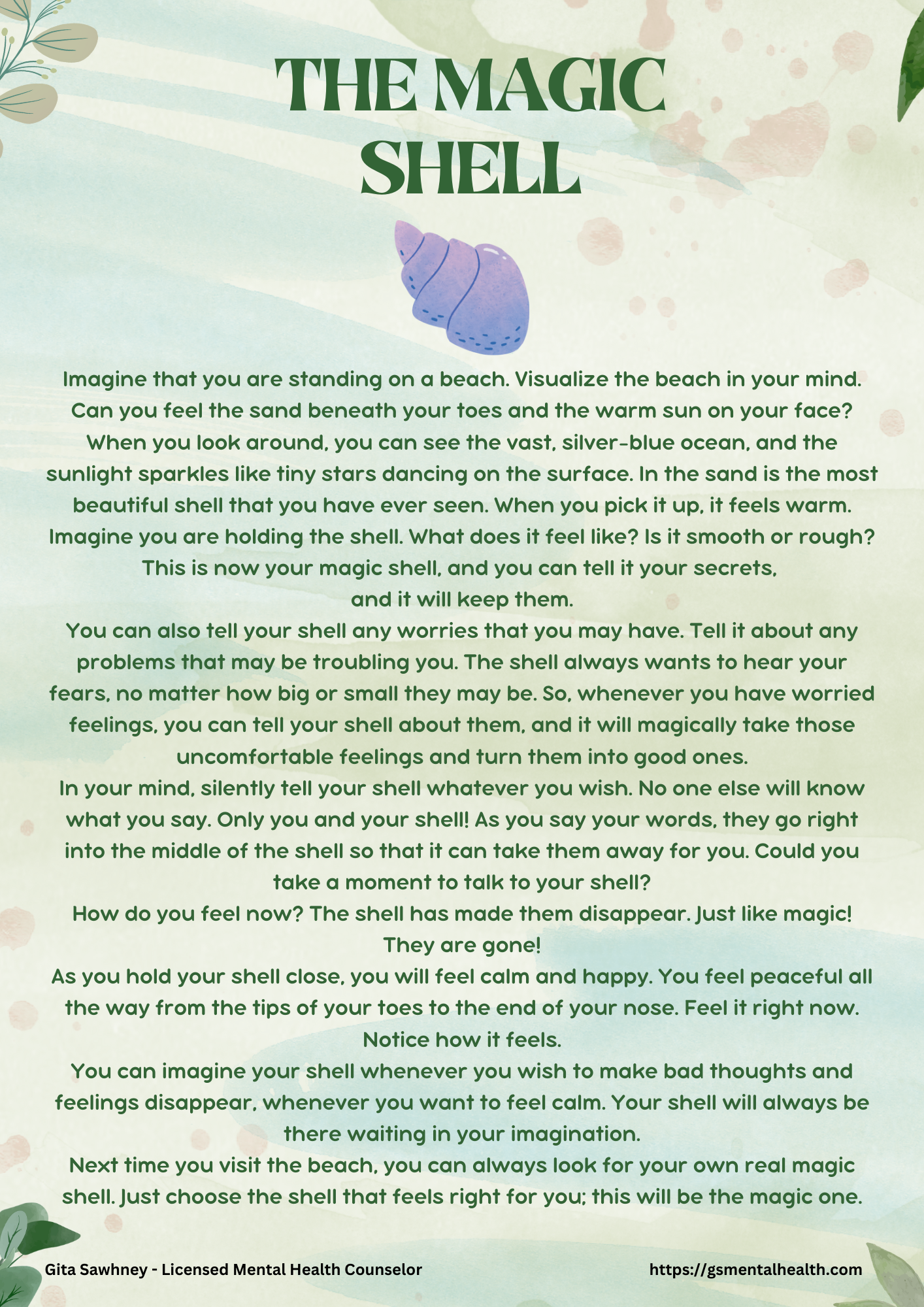 When you look around, you can see the vast, silver-blue ocean, and the sunlight sparkles like tiny stars dancing on the surface. In the sand is the most beautiful shell that you have ever seen. When you pick it up, it feels warm. Imagine you are holding the shell. What does it feel like? Is it smooth or rough?