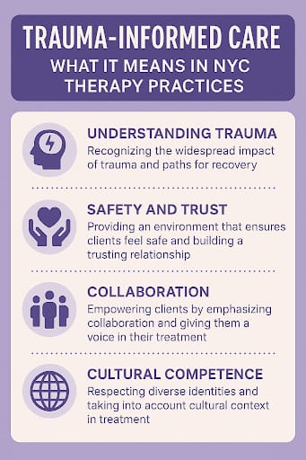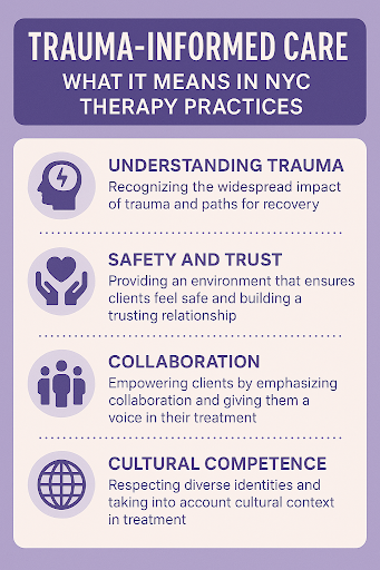 - Trauma-informed care is highly important in NYC since it can help minimize the risk of retraumatization by ensuring the therapist fosters a safe, supportive environment where clients feel they have agency or control, transforming the client experience to avoid triggers and helplessness.